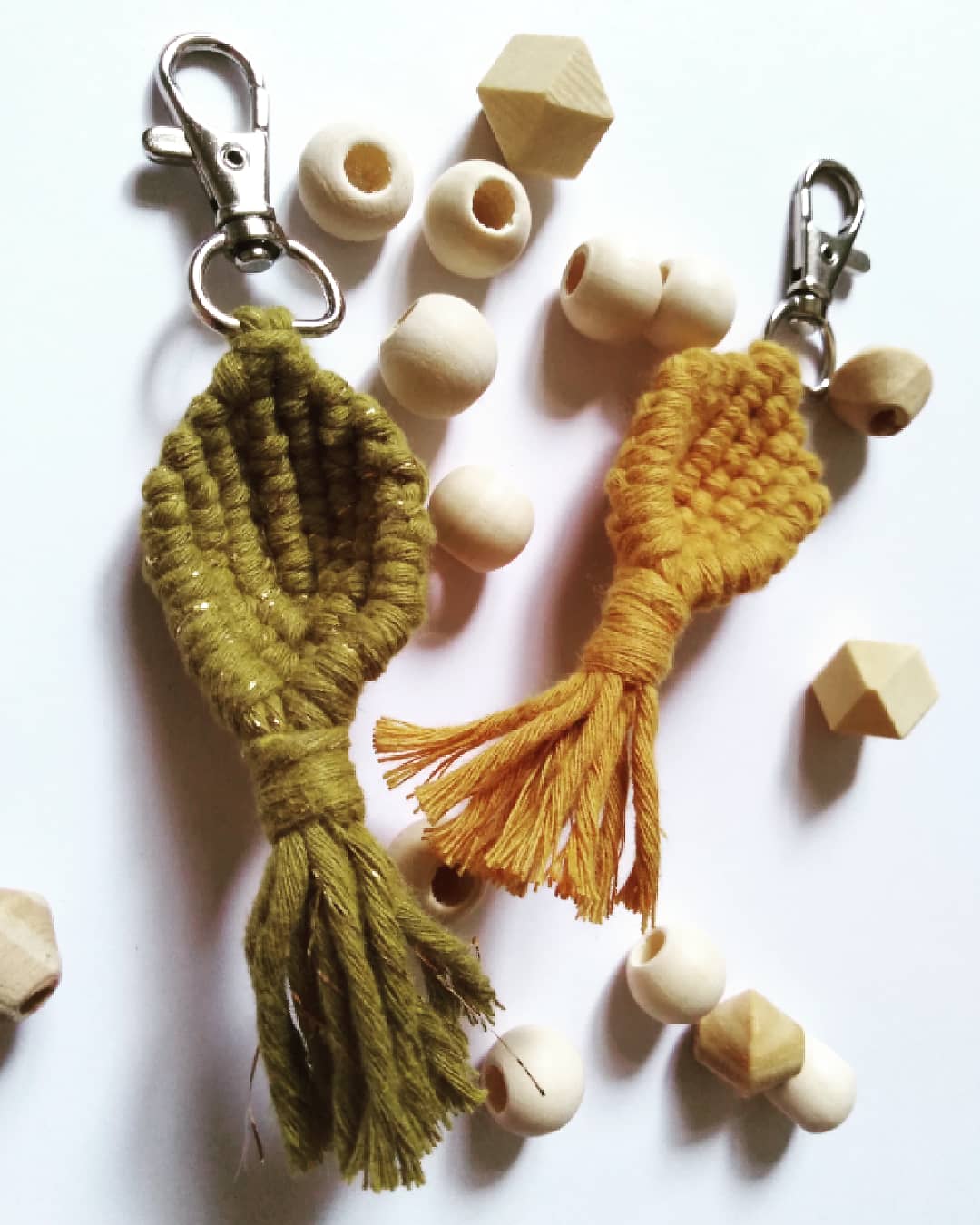 Macrame Klíčenka malá s/bez dřevěnými korálky, materiál: 100 % přírodní recyklované příze, barva: Kiwi and gold a Mustard, šířka příze: 1,5 mm, dřevěné korálky: s vroubky, skosený, velikost klíčenky: 13 x 2 cm,